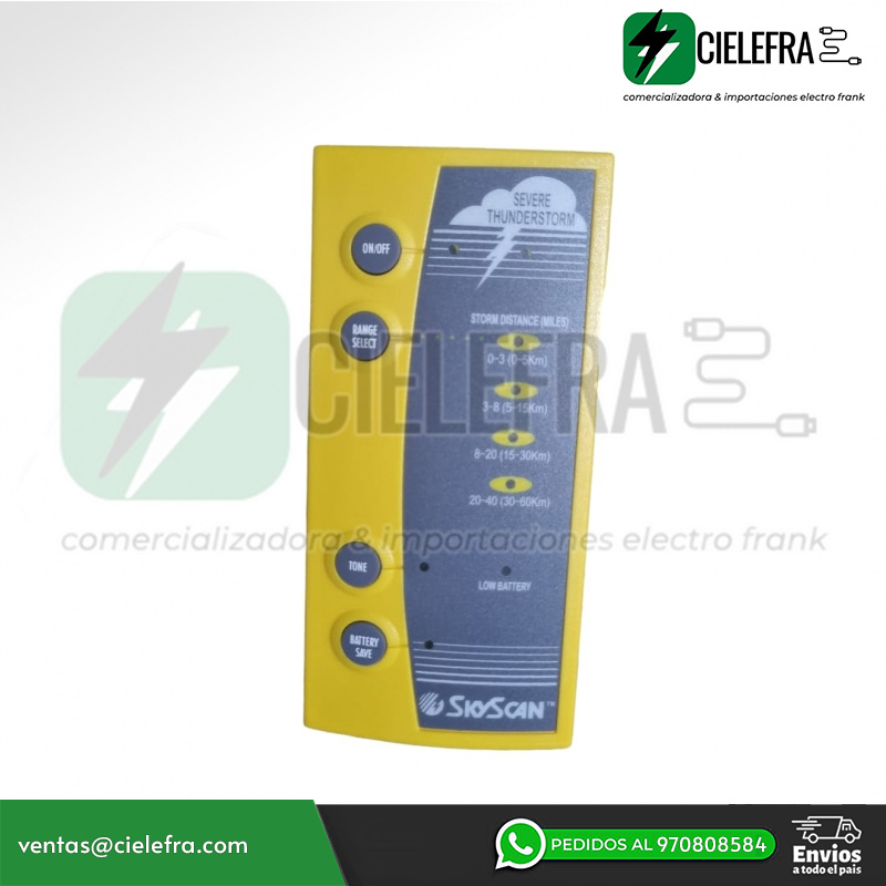 Detector de tormentas eléctricas o detector de rayos portátil SKYSCAN. Modelo P5-3 de alta tecnología cuya función principal es el monitoreo del clima disponible en cualquier lugar en el mundo. Por ello, este detector de rayos es un instrumento fácil de transportar, con un sistema electrónico que detecta la presencia de actividad de rayos / tormentas eléctricas. SkyScan portátil permite conocer la dirección en que se está movilizando una tormenta. Cuenta con la opción de emitir un sonido de advertencia cada vez que detecta un movimiento de rayos. Además, se ilumina el indicador de los rangos de cercanía.
