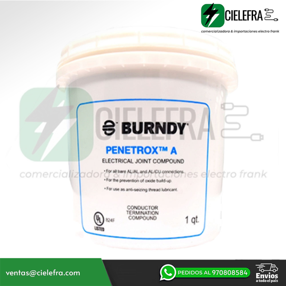 PENETROX A consta de un vehículo con base natural (petro-leum) en el que se suspenden partículas de zinc, para aplicaciones de aluminio a aluminio, aluminio a cobre y roscas de conducto de aluminio, no se recomienda su uso con conductores aislados de caucho y polietileno, UL Listado a 600 voltios, el contenedor consta de: Vehículo base natural (petróleo) con partículas de zinc suspendidas, Punto de fluidez (máximo): -15 DEG F, Punto de goteo (mínimo): 230 DEG F, Penetración (sin trabajar): 230 De acuerdo con ASTM D217, voltaje nominal: 600 V