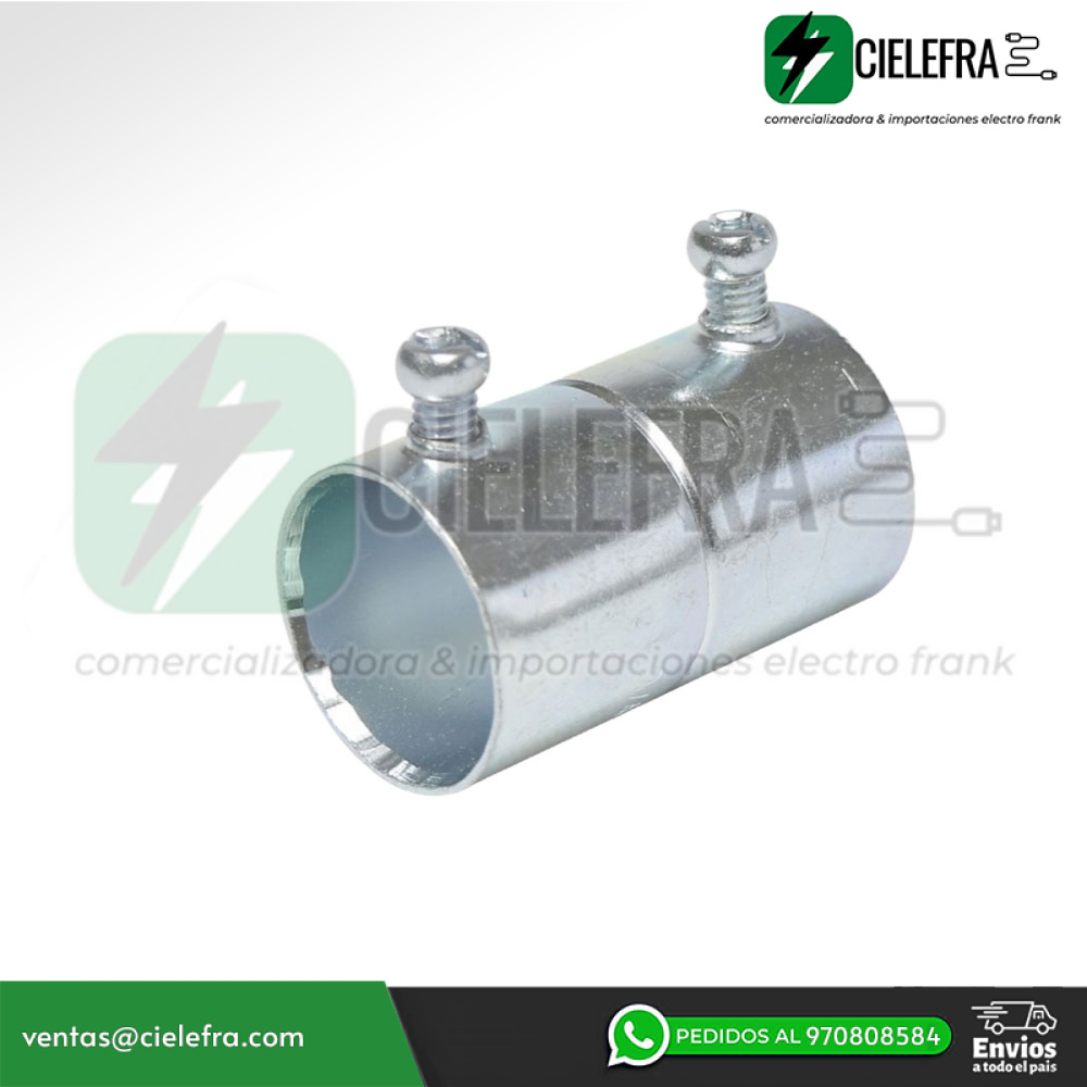 Unión Conduit de acero galvanizado. Se utilizan para unir dos tramos de tubo Conduit EMT a través de fijación a presión mediante tornillos. Certificación: UL.