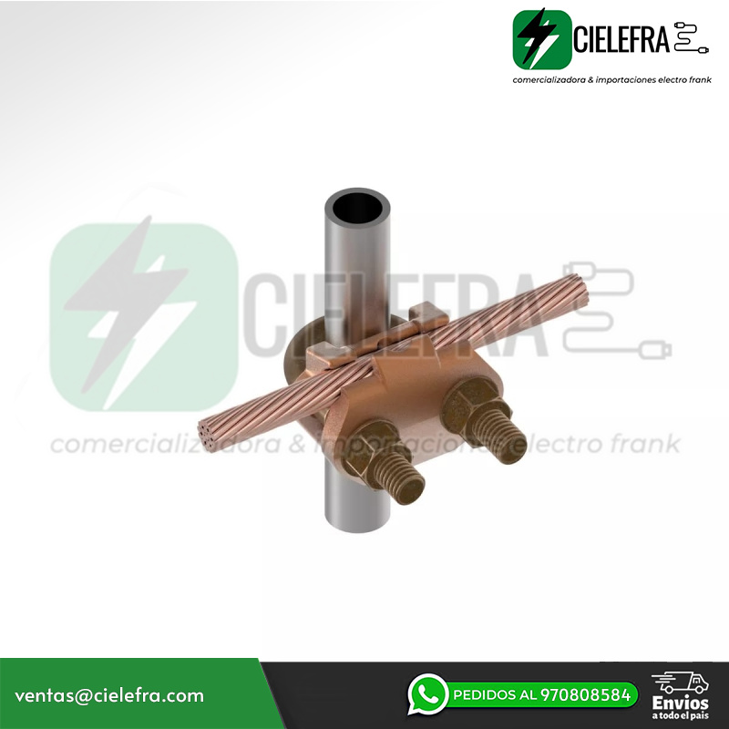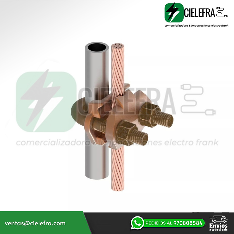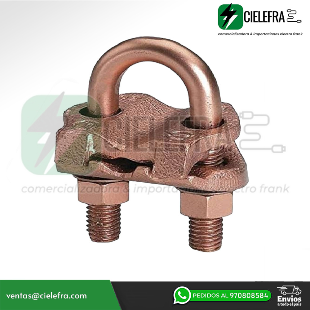 Características: Conector a tierra de aleación de cobre alto para unir una gama de cables, paralelo o en ángulo recto a varillas o tubos, especialmente bueno para postes de cercas, cuerpo fundido de aleación de cobre alto con pernos en U, tuercas y arandelas de seguridad DURIUM, permite que toda la conexión se entierre en tierra u hormigón sin peligro de corrosión, instalación con una sola llave, listado UL467, aceptable para entierro directo, altura: 2-7/8 pulgadas, tamaño de varilla de tierra: 5/8 - 3 /4 IN, Tamaño del tubo (ips): 3/8 IN, Par de instalación: 240 IN-LB, Tamaño de barra de refuerzo: #5 (5/8 IN) - #6 (3/4 IN).