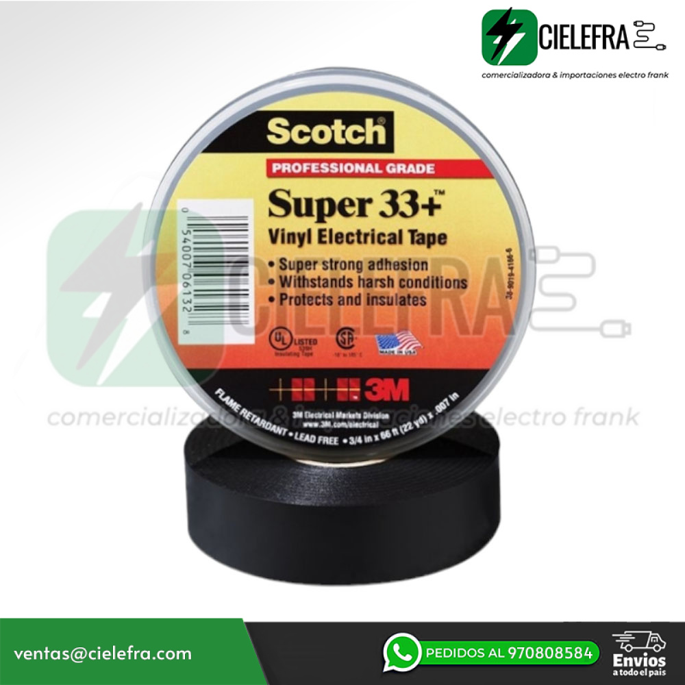 Cinta aislante vinílica de alta performance Scotch 33+ color negro. Material: PVC. Ancho: 3/4", longitud: 20 metros, espesor: 0.18mm, elongación: 250%, rigidez dieléctrica: 56.5kV/mm. Retardante a la llama, temperatura de operación: -18°C a 105°C. Aplicación: empalmes en baja tensión hasta 1kV.